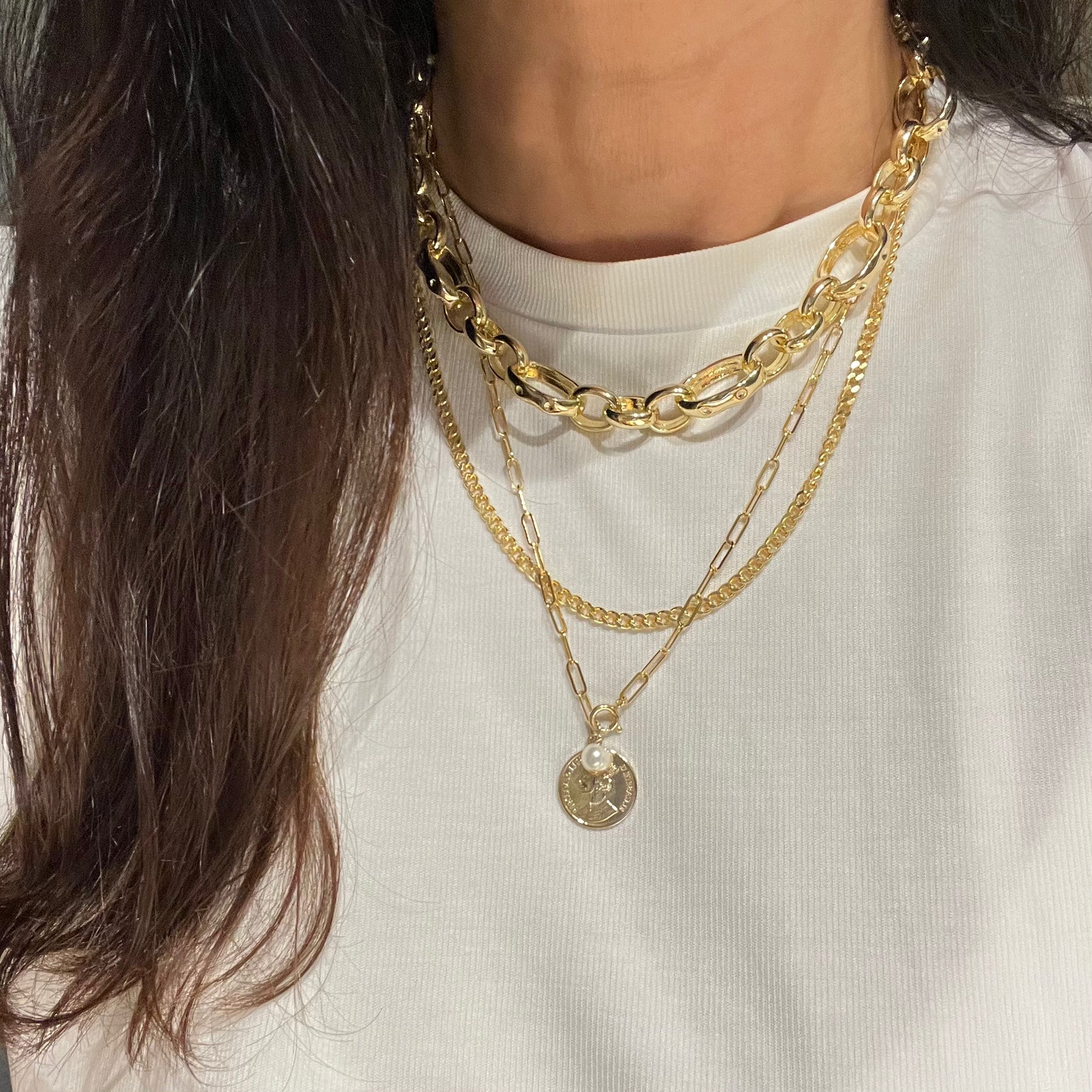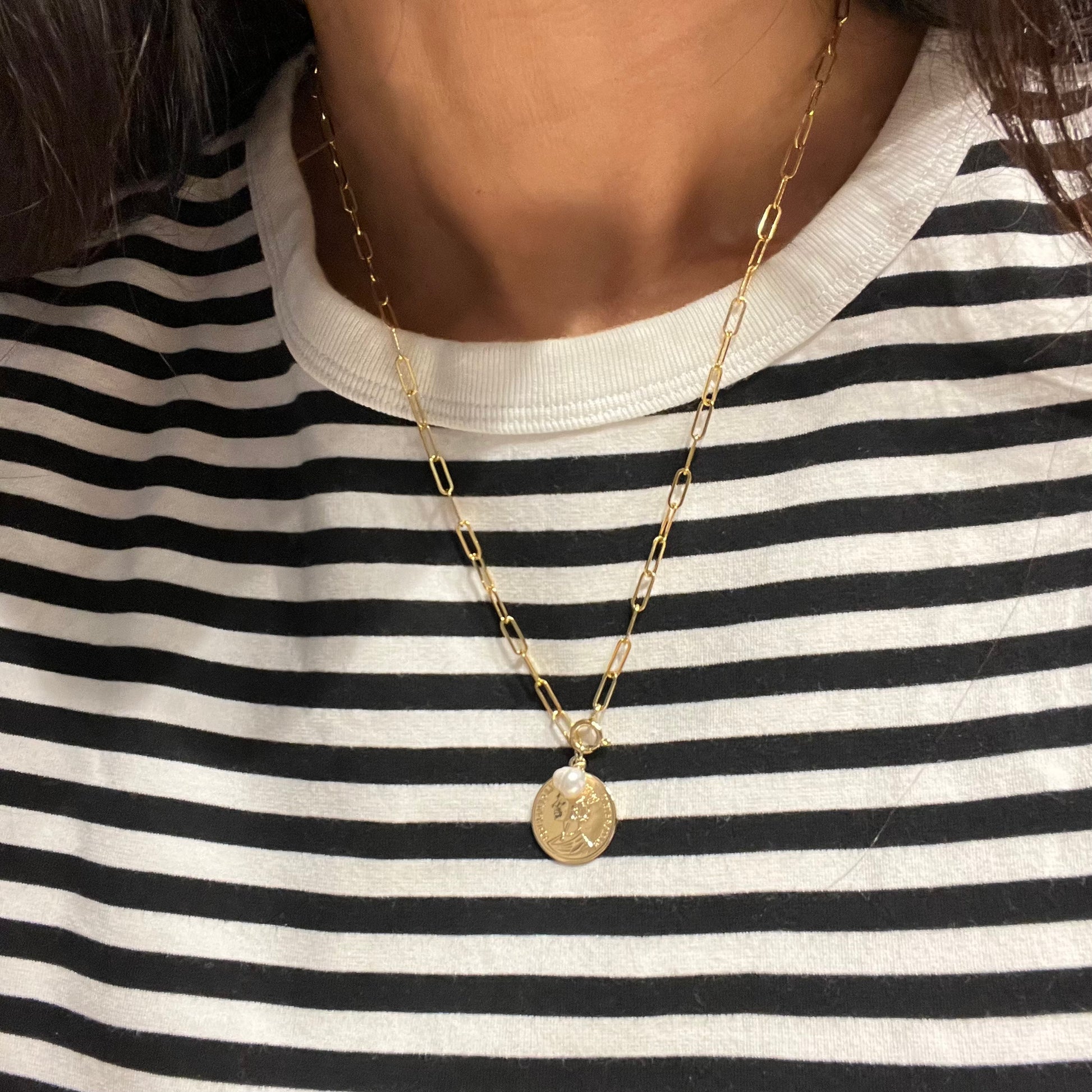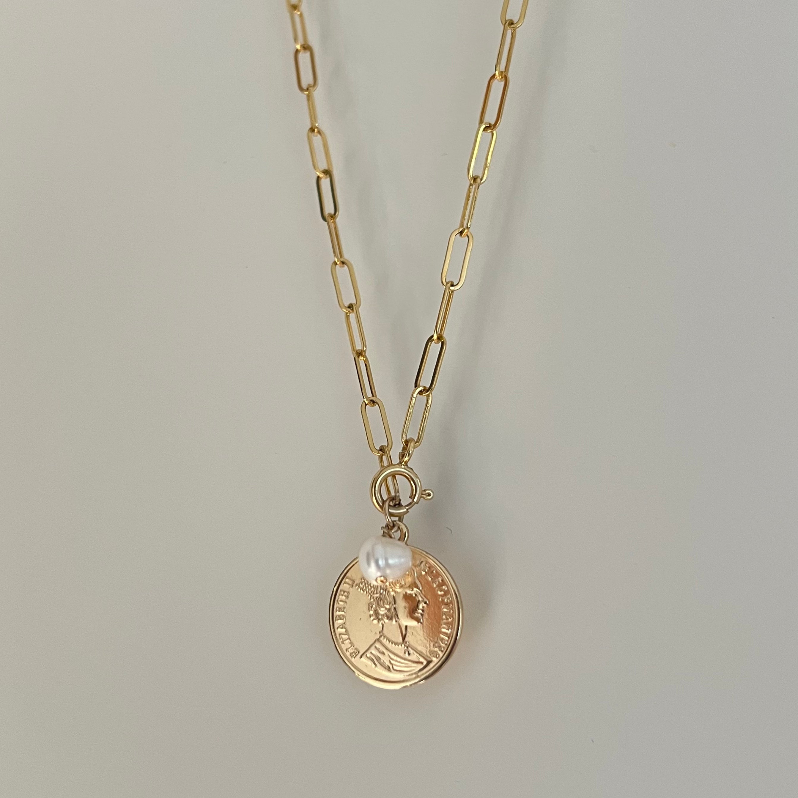 שרשרת חוליות מלבניות עדינה ומדוייקת! עם תליון מטבע וצארם פנינה קטן
