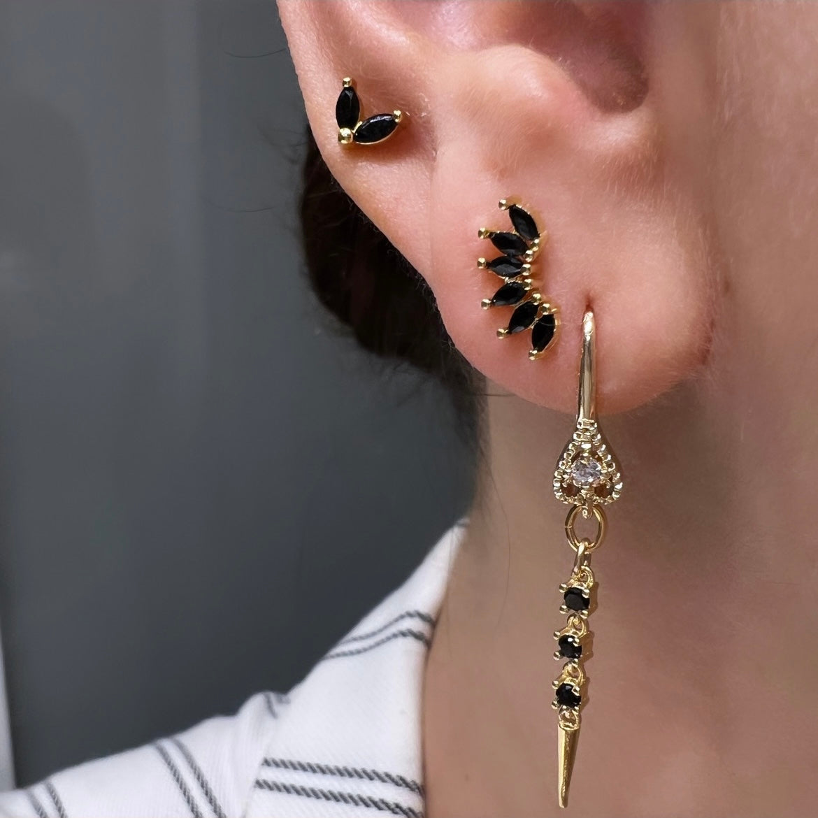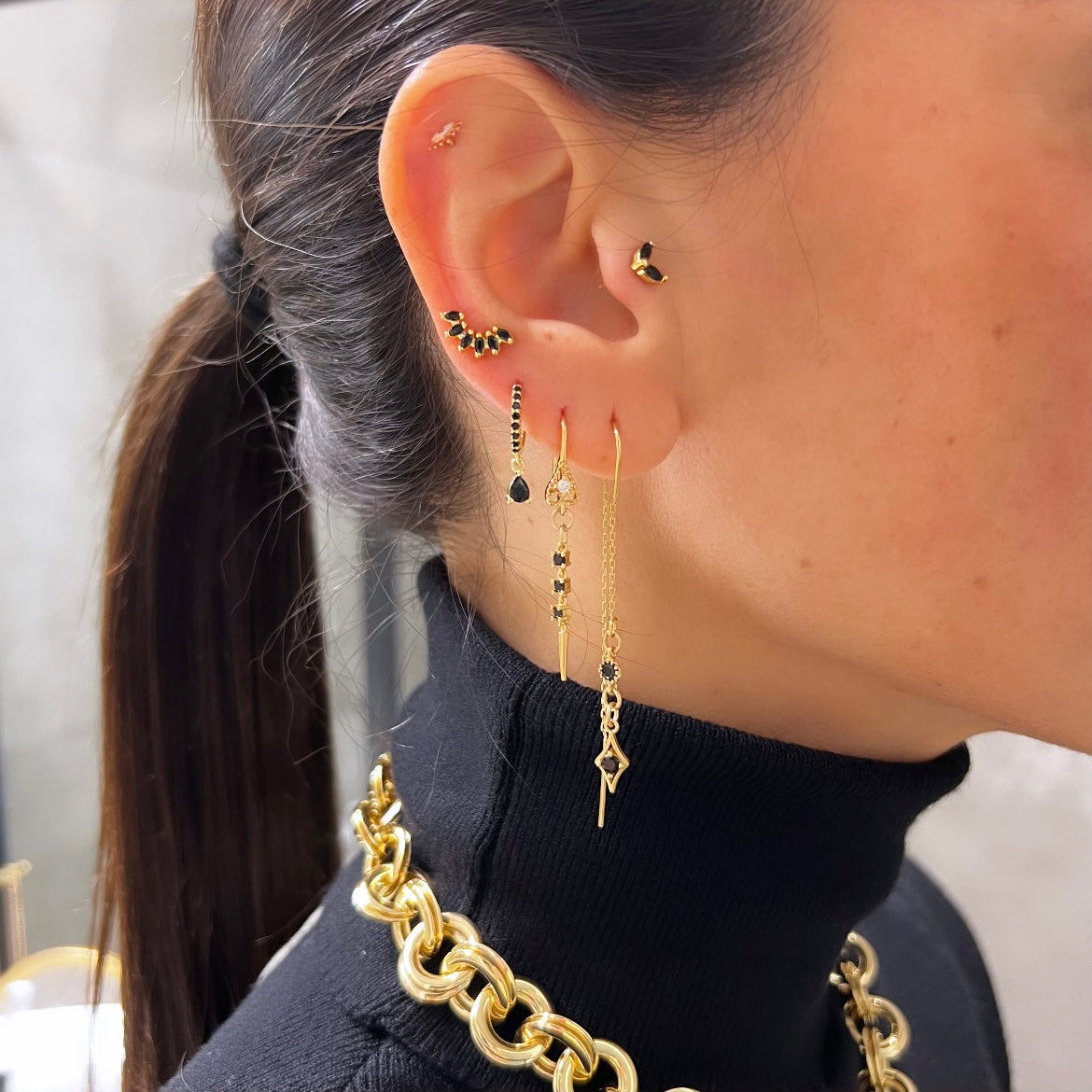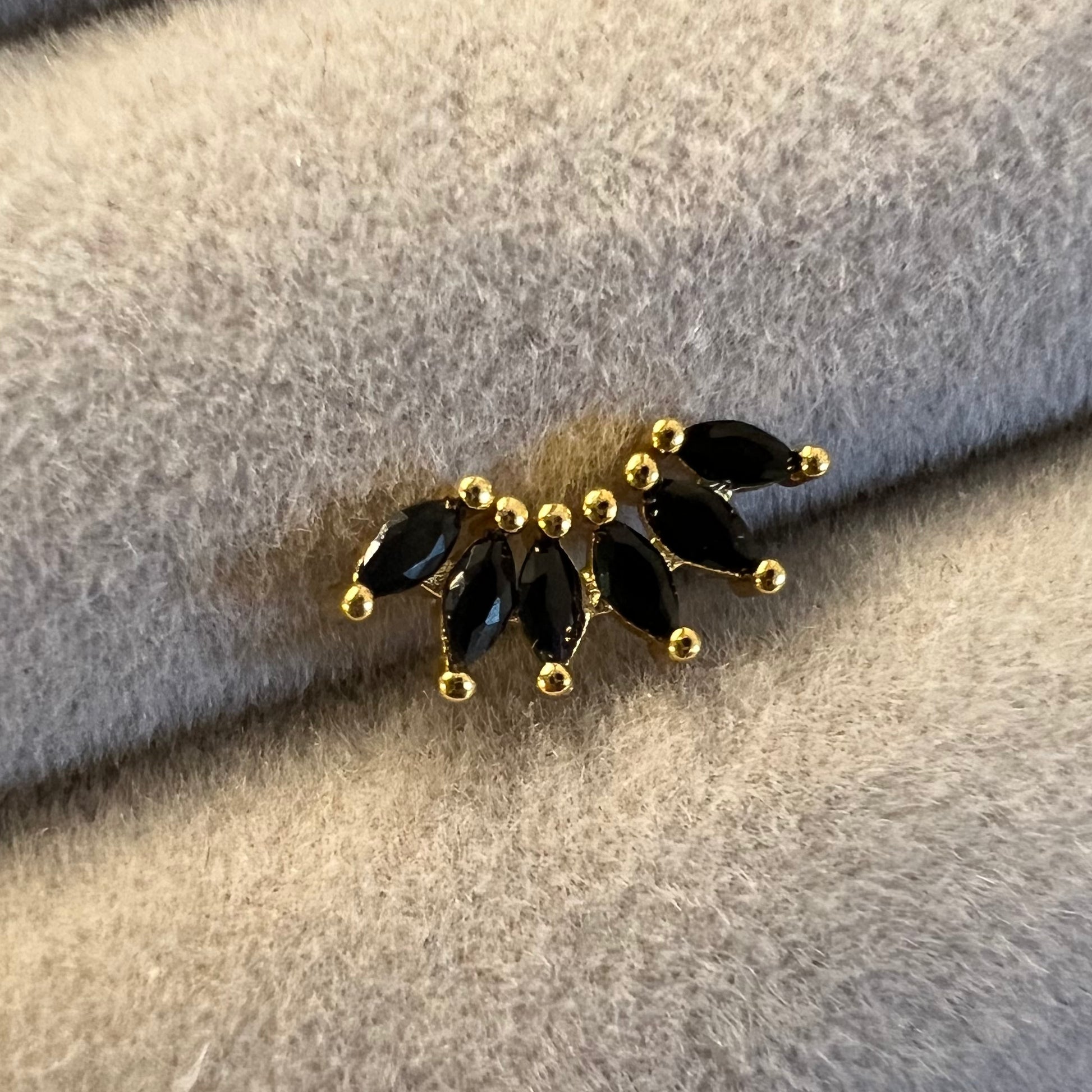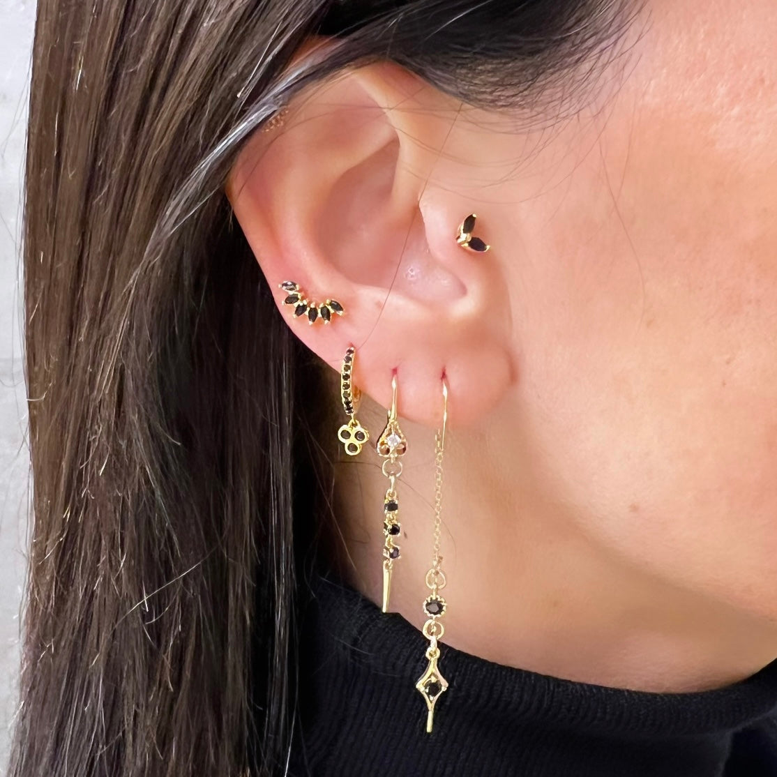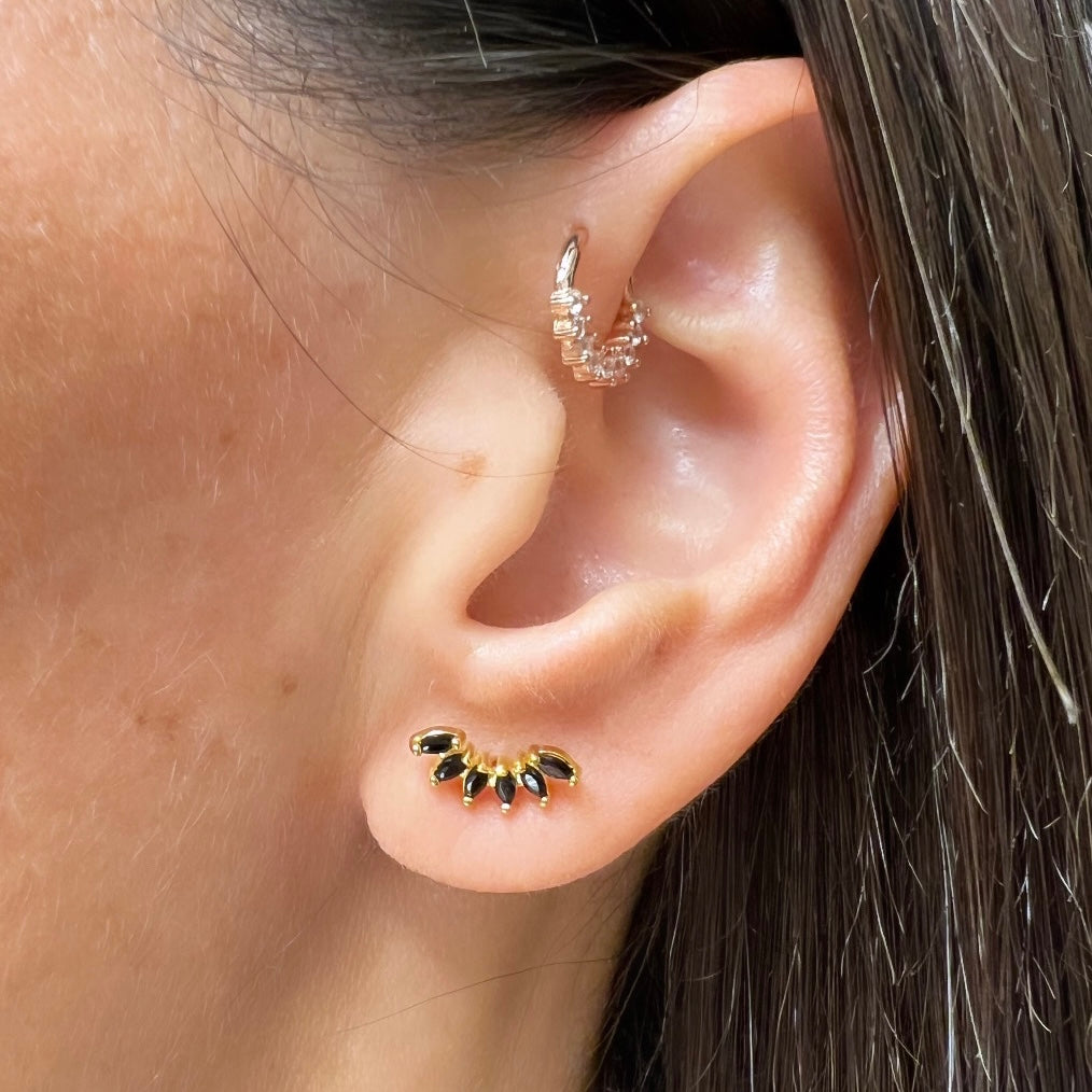 עגיל כתר צמוד אוזן משובץ זירקונים שחורים הנותן מראה מיוחד ועדין. משתלב נפלא עם עגילים נוספים למראה שכבות. ניתן לענוד גם בעגילי הליקס.