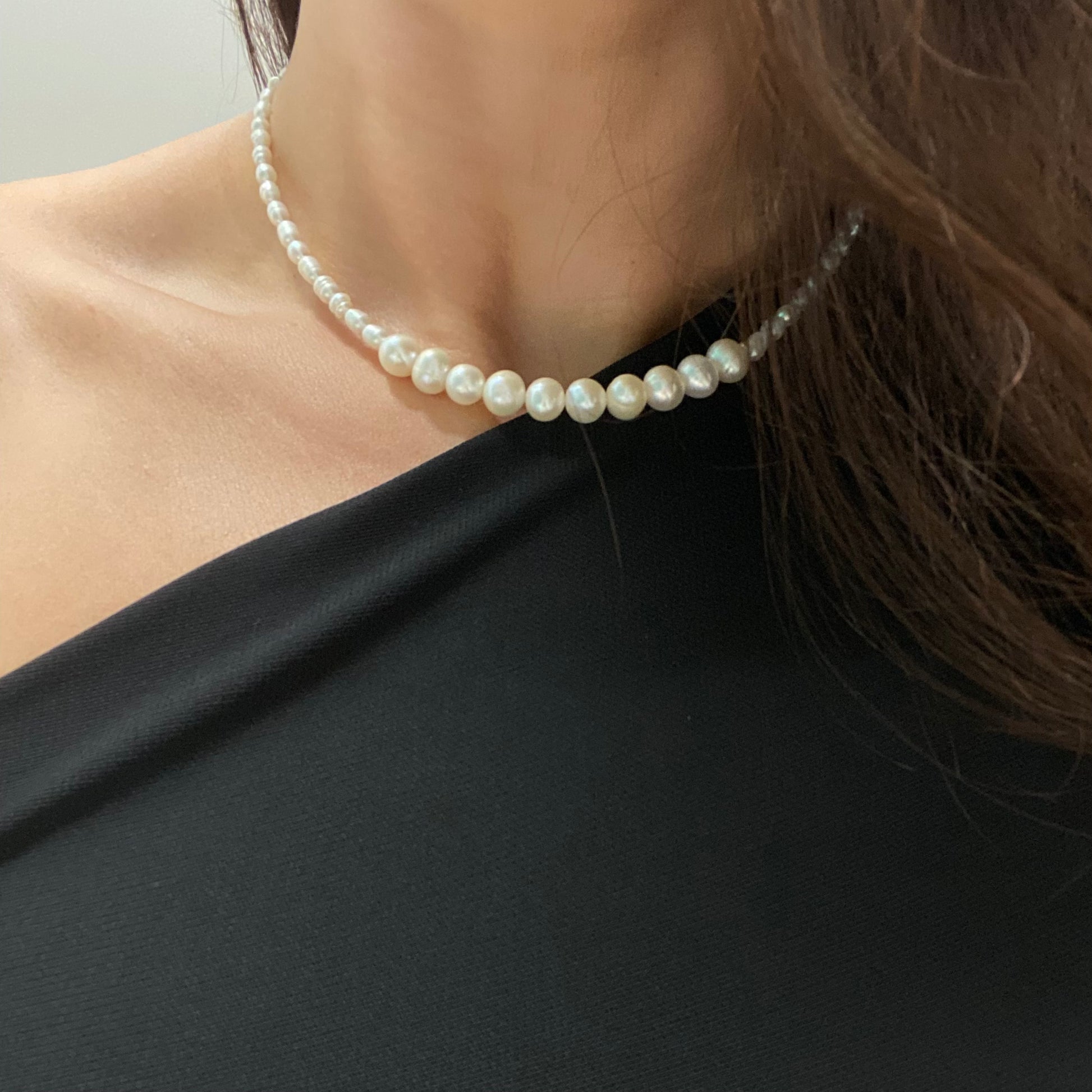 השרשרת שזורה פנינים מתורבתות טבעיות ואיכותיות! ולכן, גודלן וצורתן משתנה מפנינה לפנינה