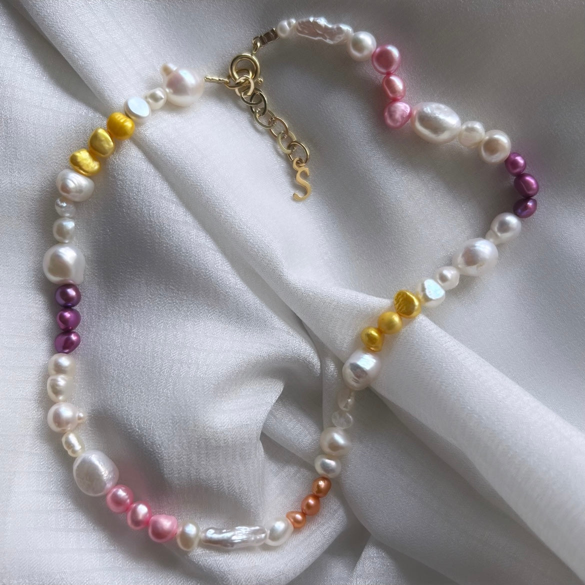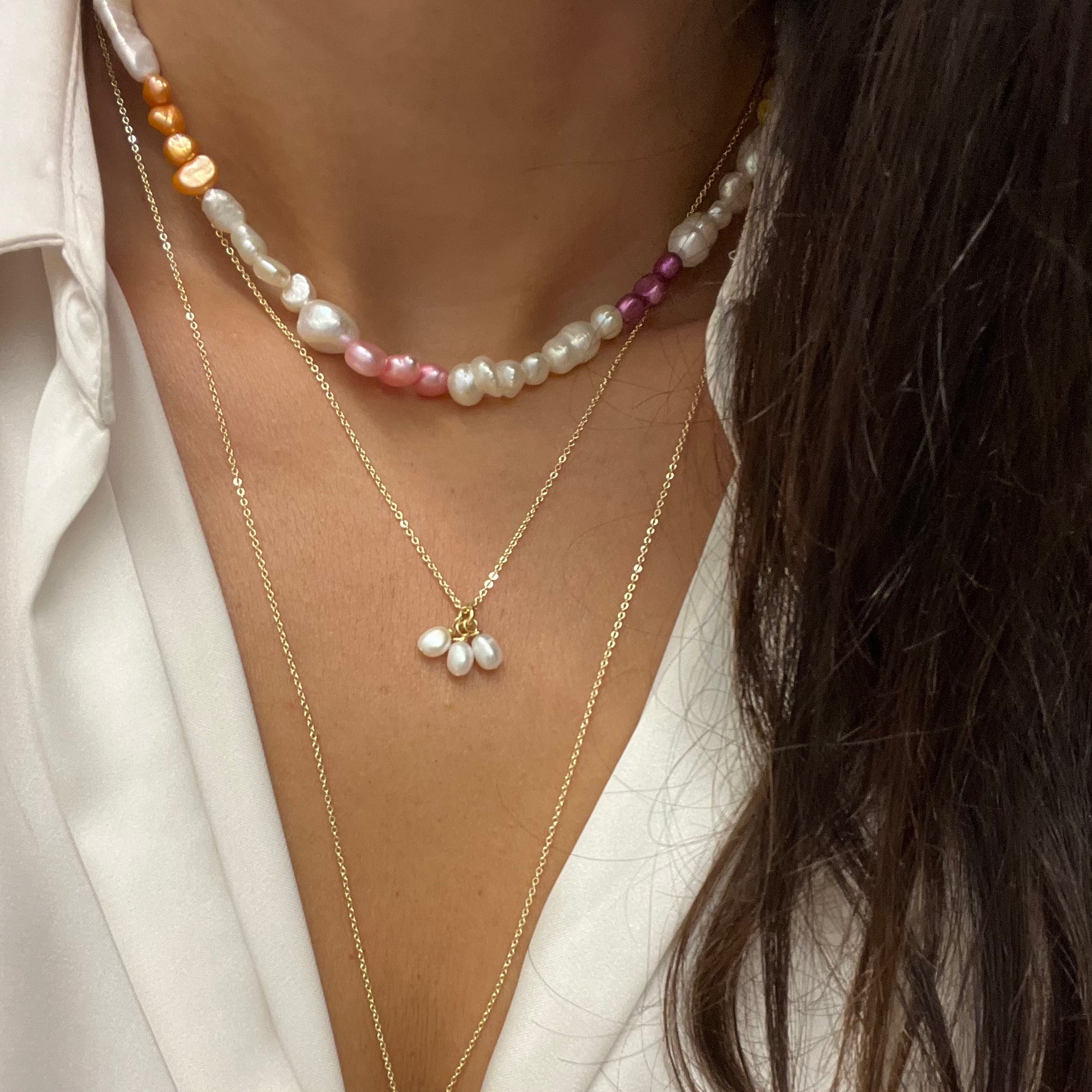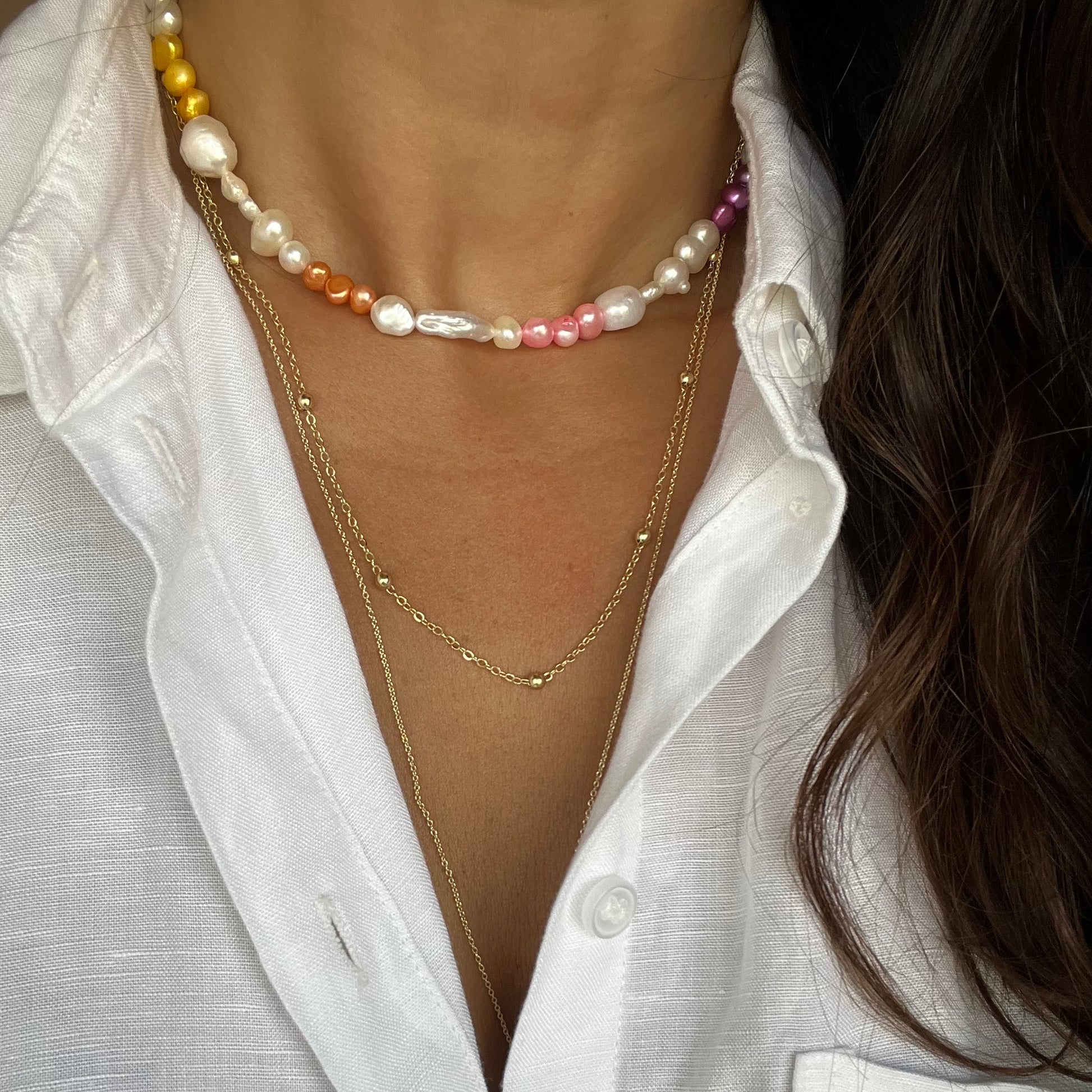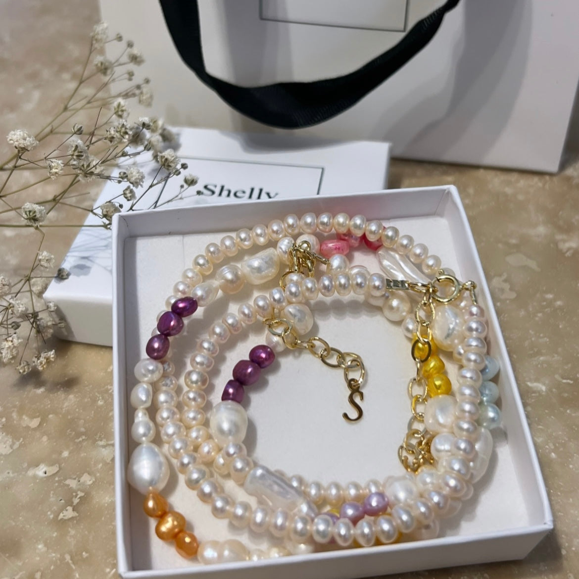 שרשרת באלי שזורה פנינים לבנות וצבעוויניות למראה רענן וקליל. היא מתאימה לכל סטייל שתבחרי.