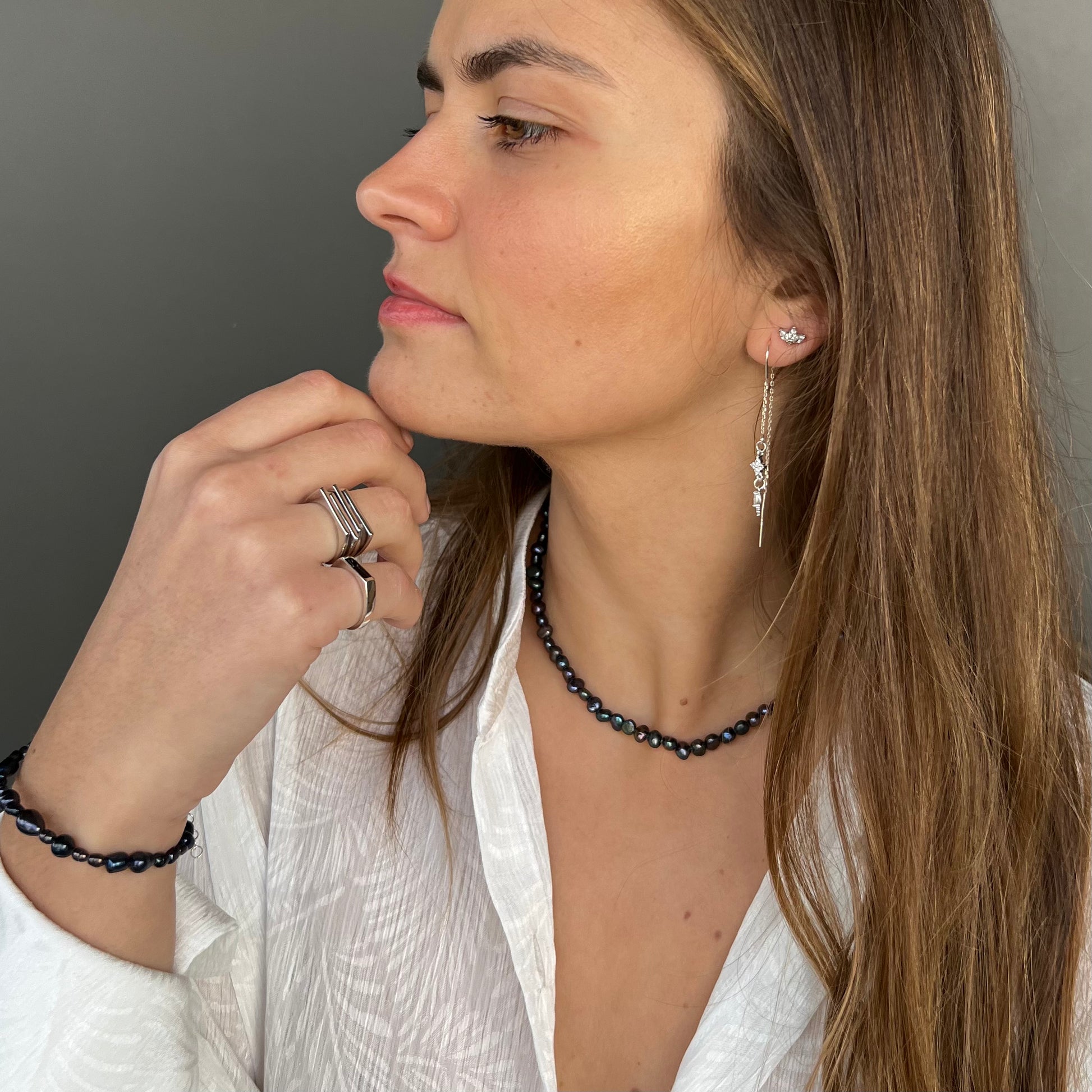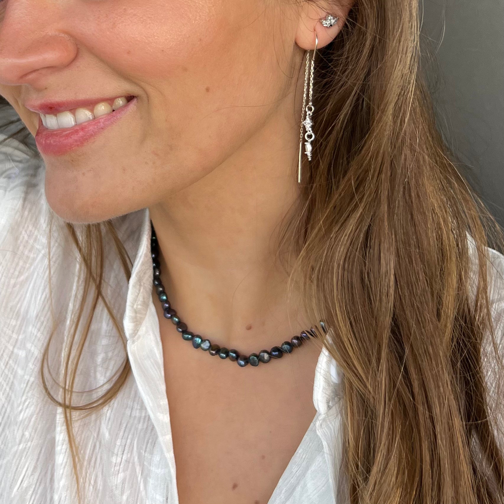 שרשרת איימי עשוייה פנינים שחורות אסימטריות למראה עדין ויום יומי משתלבת נפלאה עם שרשראות נוספות למראה שכבות קלאסית.
